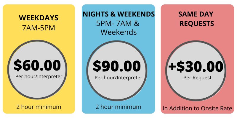 TWO-HOUR MINIMUM — In accordance with industry standards, our interpreting services include a two-hour minimum charge for every request.