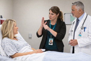 Communication: Speak directly to the Deaf individual, not to the interpreter. Say “How are you feeling today?” rather than “Ask her how she’s feeling.” Speak at a normal pace and volume.